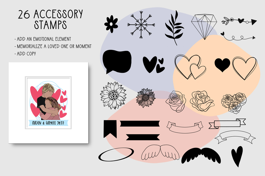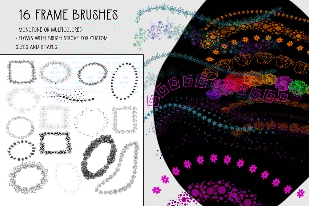 • 9 Drafting Brushes • 18 Trim Brushes • 23 Seamless Pattern Brushes • 26 Accessory Stamps • 16 Frame Brushes • 20 Backdrop Stamps • 8 Texture Brushes